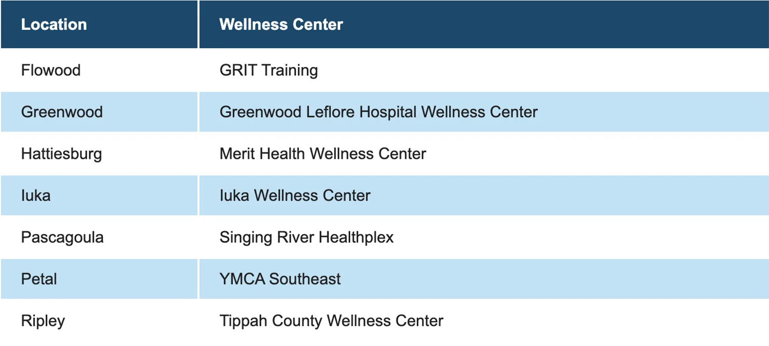 As part of our commitment to a healthier Mississippi and a healthier you, Blue Cross & Blue Shield of Mississippi (BCBSMS) is making it easier for you to start and maintain that all-important exercise routine. We partner with select wellness centers throughout the state and have arranged for our Members to receive corporate discount rates upon joining. Show your current BCBSMS ID card when you first sign up at one of our participating centers, and you'll get a discount. You may be asked to provide additional information to verify your eligibility. The specific discount varies depending upon the wellness center you choose.